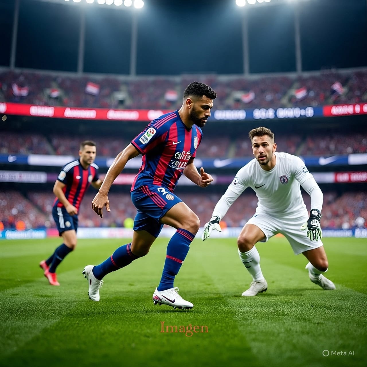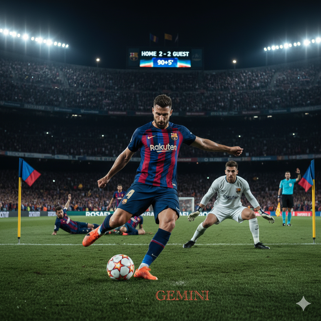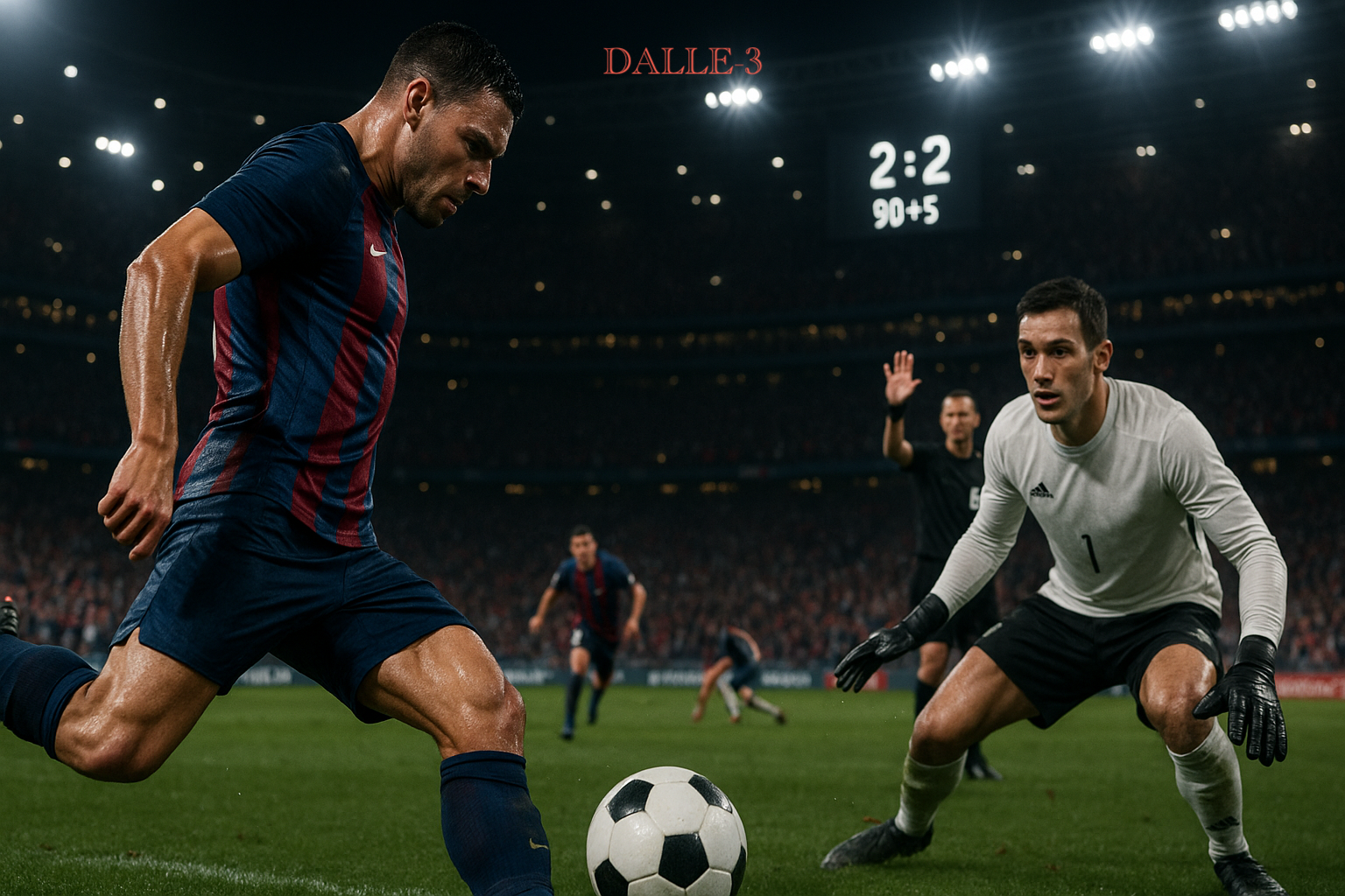 “Ultra-photorealistic freeze-frame of a night-time football stadium, 90 000 capacity, tiered stands blazing with floodlights, crowd a sea of waving scarves and raised arms, scoreboard reading 2-2 and 90+5’. Centre foreground: striker in sharp-focus, blue-and-garnet vertically striped jersey soaked with sweat, powerful thigh muscles tensed, right foot drawn back to strike a stationary ball, studs glinting. His face locked in concentration, veins visible on clenched jaw. Opposite: goalkeeper in pristine white long-sleeved jersey, crouched slightly, gloved hands open, eyes wide with tension, beads of sweat on forehead catching light. Behind them: blurred defenders sliding in desperation, corner flags whipping, advertising boards glowing. Referee in background mid-gesture, five fingers raised holding electronic timer. Depth-of-field f/2.8, cinematic 35 mm lens, high shutter speed frozen motion, dramatic chiaroscuro floodlighting, crisp 8K detail, authentic Nike/Adidas kit textures, dewy grass blades visible, bokeh crowd lights, atmosphere thick with tension”